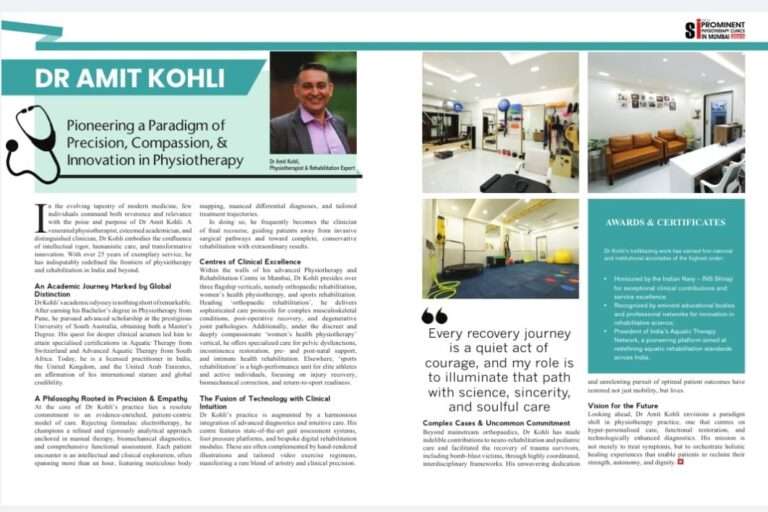 A trailblazer in his field, Dr. Kohli co-founded AquaCentric Therapy, India’s pioneering aquatic rehabilitation centre. He also worked at P.D. Hinduja Hospital, where he built trust and respect among his doctors, colleagues, and the community. His active clinic in Juhu, Vile Parle West, Mumbai, continues to be a hub of specialized care, offering services in Orthopaedics, Neurology, Paediatrics, Women’s Health, and Sports Rehabilitation.